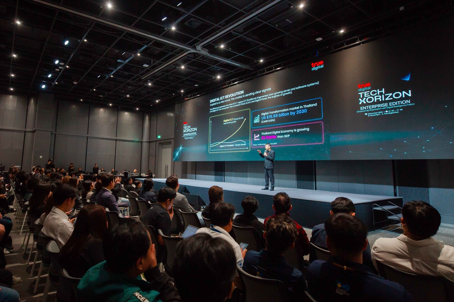 ท่ามกลางกระแสเทคโนโลยีที่เปลี่ยนแปลงอย่างรวดเร็ว องค์กรธุรกิจไม่สามารถพึ่งพาการปรับตัวแบบค่อยเป็นค่อยไปได้อีกต่อไป เวทีสัมมนา Tech Horizon: Enterprise Edition – Empowering Organization with Digital Intelligence Fabric ซึ่งจัดโดย ทรู ดิจิทัล กรุ๊ป ผู้นำบริการดิจิทัลครบวงจร ในเครือทรู คอร์ปอเรชั่น ได้สะท้อนมุมมองในทิศทางเดียวกันของทั้งภาครัฐและเอกชนว่า “เทคโนโลยีดิจิทัล” ไม่ได้เป็นเพียงเครื่องมือเพิ่มประสิทธิภาพ แต่กำลังกลายเป็น “โครงสร้างพื้นฐานใหม่” ที่ชี้ชะตาอนาคต กำหนดความสามารถในการแข่งขันขององค์กรและประเทศ ในยุคที่บริบทของเทคโนโลยีแห่งอนาคตกำลังหลอมรวมเข้าหากัน ทั้ง AI, IoT, Cloud, Data และ Cybersecurity โดยไม่อาจถูกมองหรือบริหารแยกส่วนได้เหมือนในอดีต