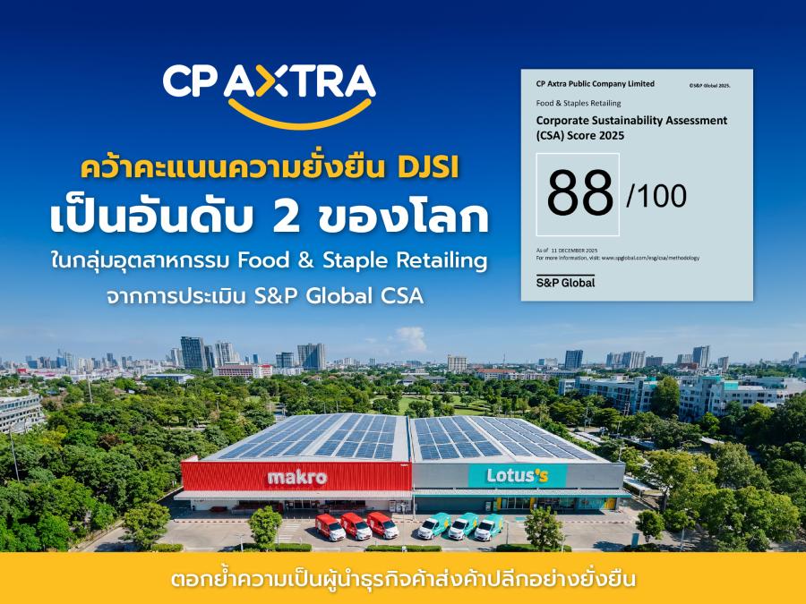บริษัท ซีพี แอ็กซ์ตร้า จำกัด (มหาชน) หรือ CP AXTRA ผู้ดำเนินธุรกิจค้าส่งค้าปลีก “แม็คโคร–โลตัส” สร้างผลงานโดดเด่นด้านความยั่งยืนระดับโลก จากการประเมิน Corporate Sustainability Assessment (CSA) โดย S&P Global องค์กรผู้จัดทำดัชนี Dow Jones Sustainability Indices (DJSI) ด้วยคะแนนรวม 88 จาก 100 คะแนน ในปี 2025 ซึ่งเพิ่มขึ้นอย่างต่อเนื่องจากปี 2023 และ 2024 ส่งผลให้บริษัทขยับขึ้นสู่อันดับ 2 ของโลกในกลุ่มอุตสาหกรรม Food & Staples Retailing สะท้อนถึงความมุ่งมั่นขององค์กรในการขับเคลื่อนความยั่งยืนอย่างเป็นรูปธรรม ผ่านการลงมือทำจริงและเป็นส่วนหนึ่งของการดำเนินธุรกิจในทุกมิติอย่างต่อเนื่อง โดยเฉพาะความโดดเด่นด้านการจัดการขยะอย่างเป็นระบบตลอดห่วงโซ่คุณค่า (Waste Management) เพื่อลดผลกระทบต่อสิ่งแวดล้อม ควบคู่กับการสร้างคุณค่าให้สังคมและการดำเนินธุรกิจภายใต้หลักธรรมาภิบาล พร้อมเดินหน้าสู่เป้าหมายความเป็นกลางทางคาร์บอนภายในปี 2030 และการมุ่งสู่ Net Zero ภายในปี 2050 เพื่อสร้างการเติบโตที่มั่นคงและคุณค่าที่ยั่งยืนในระยะยาว ในปี 2025 ซีพี แอ็กซ์ตร้า ดำเนินโครงการด้านสิ่งแวดล้อมอย่างเข้มข้น ภายใต้แนวคิด “ลดทิ้ง สร้างค่า AXTRA Zero Waste” สามารถลดขยะที่ต้องนำไปฝังกลบได้กว่า 31,700 ตัน แบ่งเป็นขยะอาหารกว่า 15,000 ตัน และขยะที่สามารถนำไปรีไซเคิลได้กว่า 16,755 ตัน ขณะเดียวกัน บริษัทยังดำเนินโครงการรับคืนขวดพลาสติกจากลูกค้าผ่านสาขา แม็คโคร–โลตัส ทั่วประเทศ รวมกว่า 2.2 ล้านขวด ช่วยลดการปล่อยก๊าซเรือนกระจกได้ถึง 109,649 ตันคาร์บอนไดออกไซด์เทียบเท่า หรือเทียบเท่าการดูดซับคาร์บอนของต้นไม้มากกว่า 11 ล้านต้น รวมถึงการขยายการใช้พลังงานสะอาดผ่านการติดตั้งแผงพลังงานแสงอาทิตย์ (Solar Rooftop) ในศูนย์กระจายสินค้าและสาขาแม็คโคร–โลตัส รวมกว่า 1,384 แห่ง พร้อมนำรถพลังงานสะอาดกว่า 300 คัน มาใช้ในการขนส่งสินค้า เพื่อลดผลกระทบต่อสิ่งแวดล้อมตลอดห่วงโซ่คุณค่านอกจากนี้ บริษัทให้ความสำคัญกับมิติด้านสังคมและธรรมาภิบาล ผ่านการพัฒนาศักยภาพพนักงาน การเคารพสิทธิมนุษยชน และการสร้างโอกาสทางอาชีพให้กับเกษตรกรและผู้ประกอบการรายย่อยทั่วประเทศ ภายใต้โครงการ “แพลตฟอร์มแห่งโอกาส (Platform of Opportunity)” สนับสนุนเศรษฐกิจท้องถิ่นมูลค่ากว่า 30,000 ล้านบาท เชื่อมโยงผู้ประกอบการเข้าสู่ระบบค้าส่งค้าปลีกที่มีมาตรฐาน สร้างรายได้และความมั่นคงในระยะยาว พร้อมส่งเสริมความเท่าเทียม ความหลากหลาย และการปฏิบัติต่อแรงงานอย่างเป็นธรรม ผลการประเมิน S&P Global CSA 2025 ตอกย้ำความเป็นผู้นำของ ซีพี แอ็กซ์ตร้า ในการยกระดับมาตรฐานธุรกิจค้าส่ง–ค้าปลีกไทยสู่ระดับโลก พร้อมสร้างคุณค่าอย่างยั่งยืนให้กับผู้มีส่ว