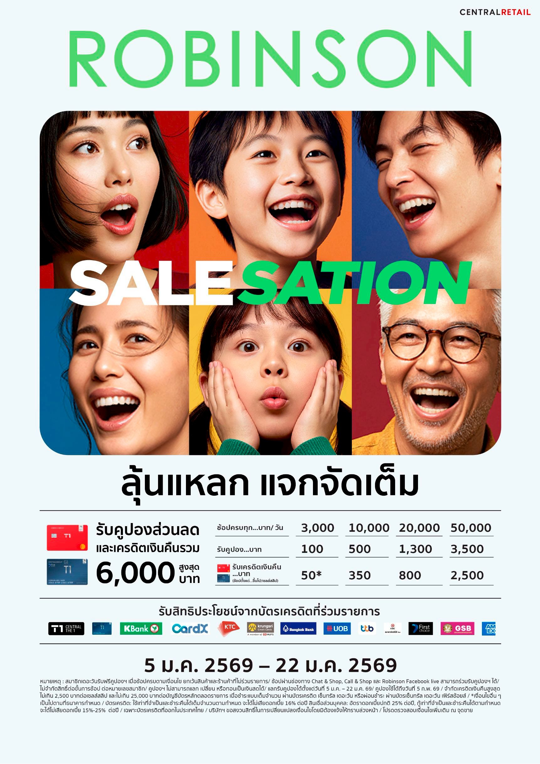 ร่วมสัมผัสประสบการณ์ ‘ช้อปคุ้ม ลุ้นสนุก’ รับปีใหม่ กับการคิกออฟซิกเนเจอร์แคมเปญแห่งปี “ROBINSON SALESATION” ลุ้นแหลก แจกจัดเต็ม ตั้งแต่วันที่ 5 ม.ค. 69 – 22 ม.ค. 69 ที่ห้างโรบินสันทุกสาขา (ยกเว้นสาขาจังซีลอน) และทุกช่องทางการ ช้อปปิ้งของห้างฯ