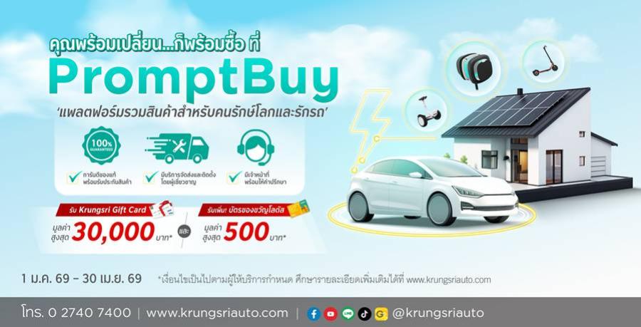 กรุงศรีอยุธยา จำกัด (มหาชน) ชวนผู้ใช้รถช้อปให้สุดรับปีใหม่กับ PromptBuy แพลตฟอร์มรวมสินค้าสำหรับคนรักษ์โลกและรักรถ ที่คัดสรรสินค้าและบริการคุณภาพไว้ครบจบในที่เดียว ตั้งแต่ของแต่งรถ อุปกรณ์ดูแลรักษารถ บริการช่วยเหลือฉุกเฉิน ไปจนถึงโซลูชันด้านเทคโนโลยีเพื่อสิ่งแวดล้อมสำหรับที่อยู่อาศัย พร้อมเตรียมมอบของขวัญสุดคุ้ม มูลค่ารวมกว่า 30,500 บาท และสิทธิ์ผ่อน 0% นานสูงสุด 10 เดือน เพียงชำระผ่านบัตรเครดิตกรุงศรี ตั้งแต่วันที่ 1 มกราคม – 30 เมษายน 2569